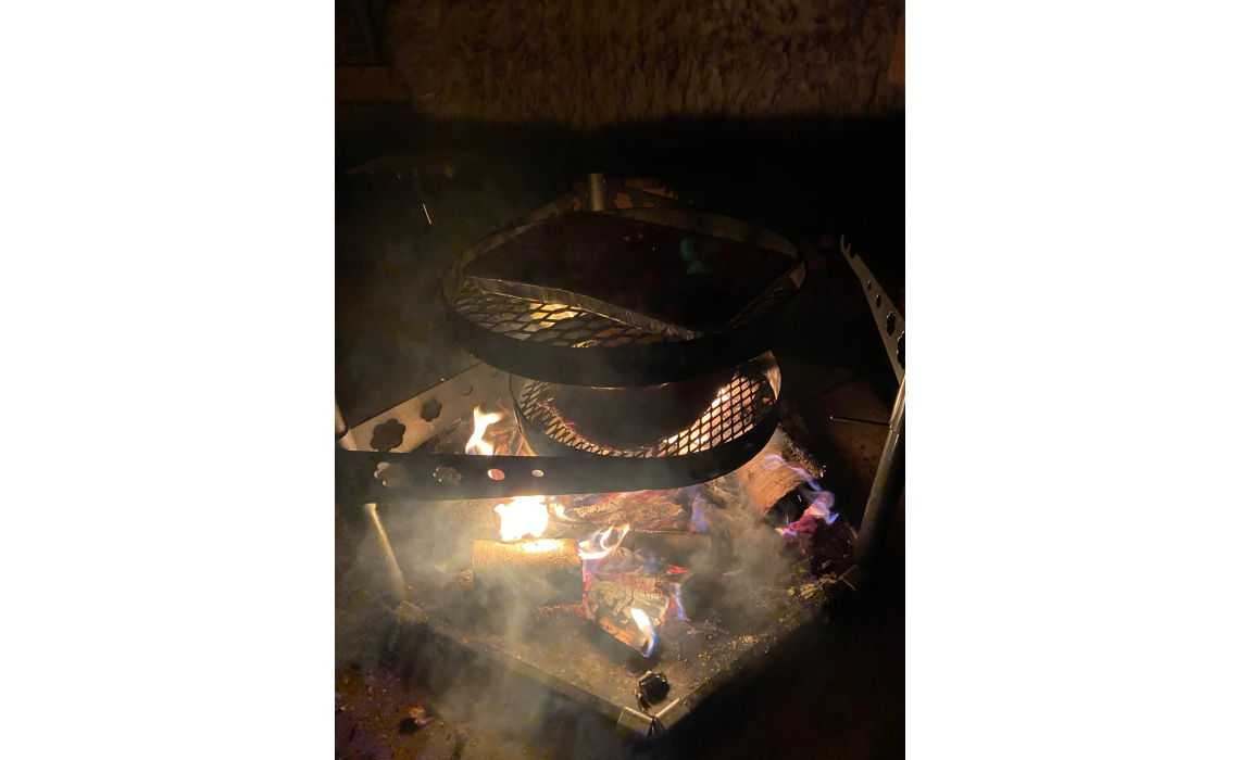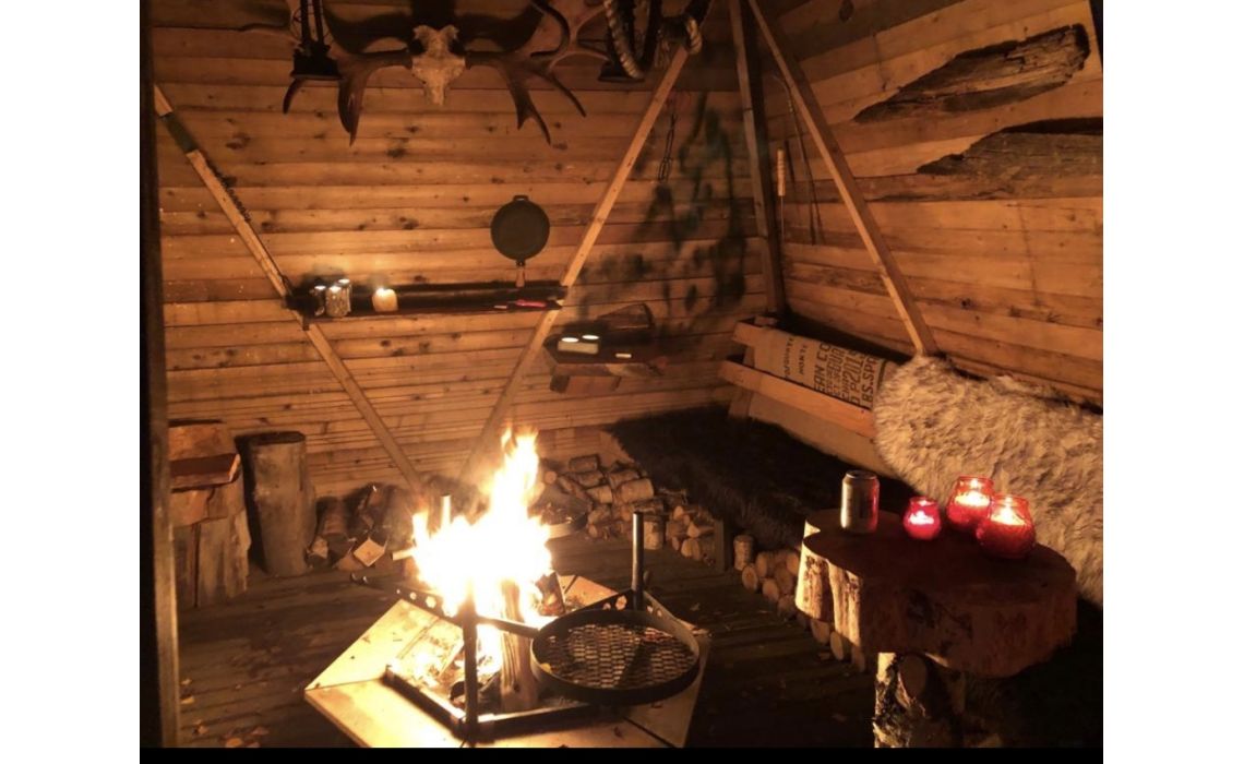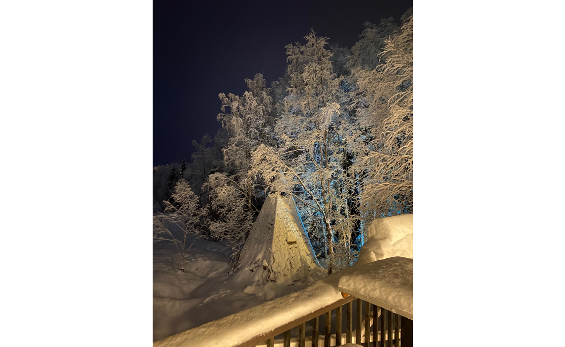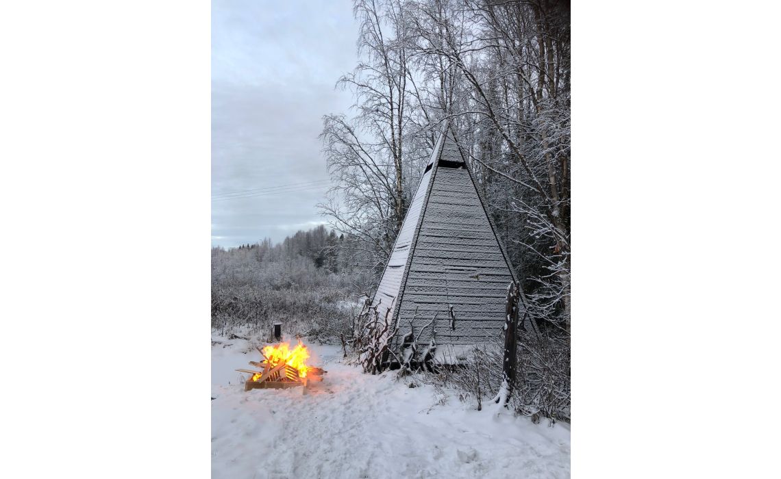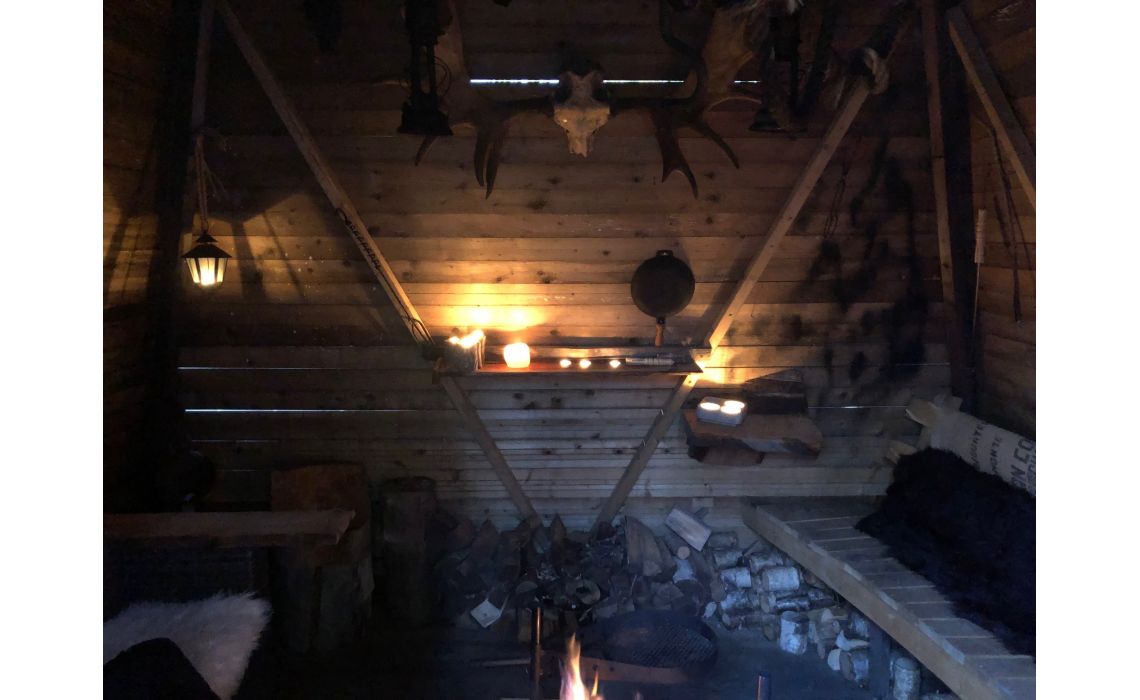 Pihalla tunnelmallinen lapinkota, jossa suurempikin joukko fiilistelee tulien äärellä.