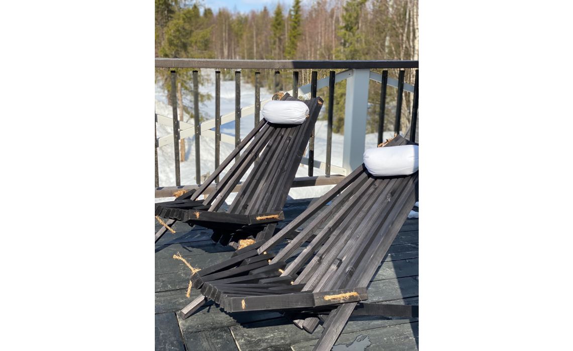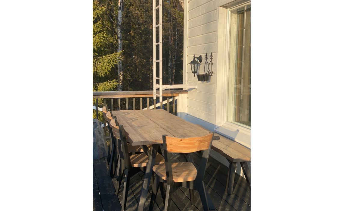 Yläkerrassa tilava kahteen suuntaan avautuva terassiparveke, jossa on mahtava hengähtää vaikka löylyjen välissä vaikka ilman rihman kiertämää. Kesällä terassilla suuri ulkoruokailuryhmä. Terassin näkymät metsään.